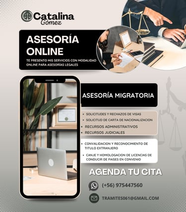 Asesoría en gestiones migratorias de residencias, carta de nacionalización, reconocimiento y convalidación de títulos, canje de licencia de conducción de países en convenio, entre otras.